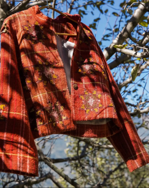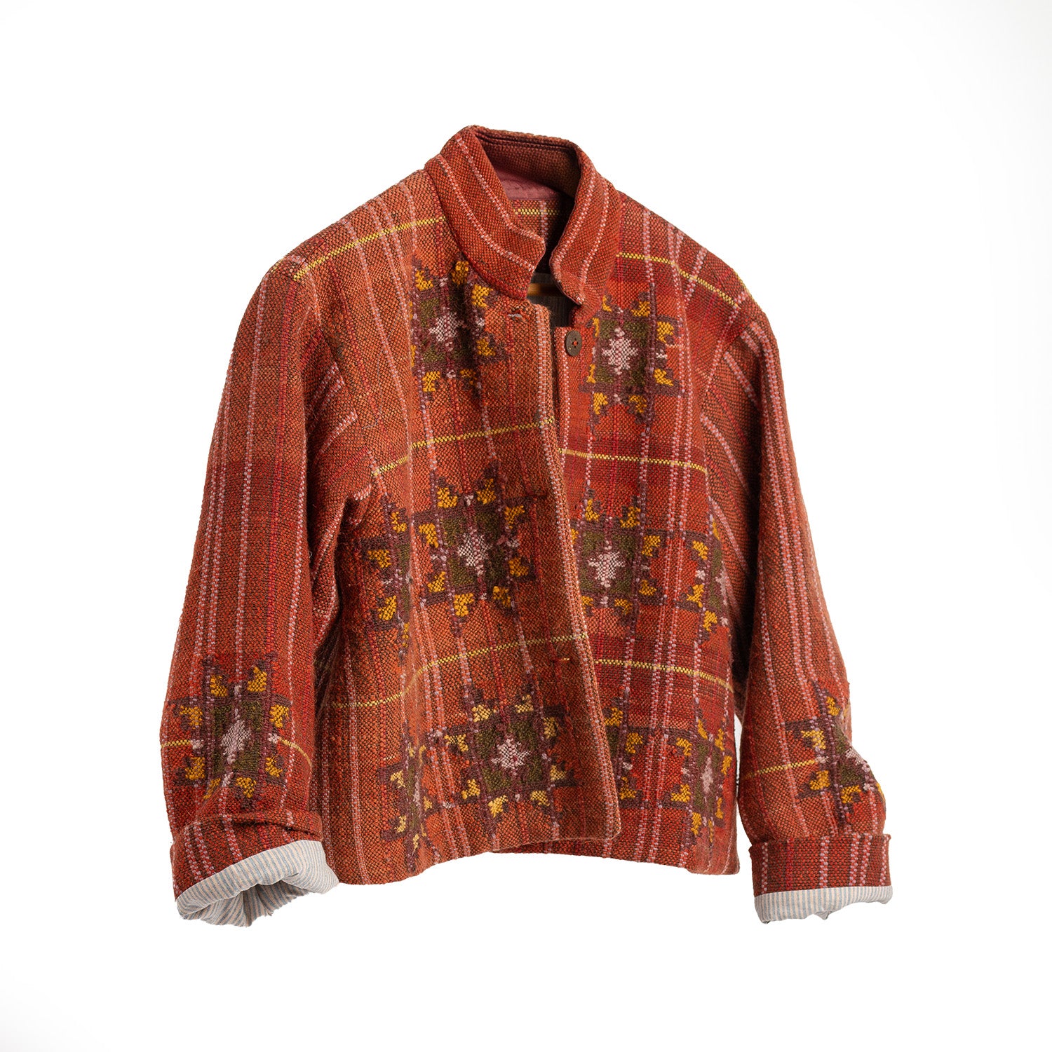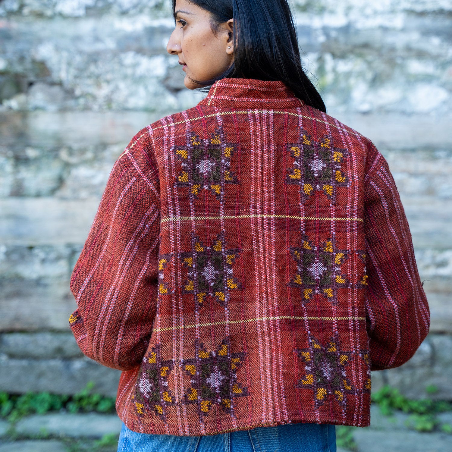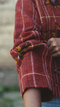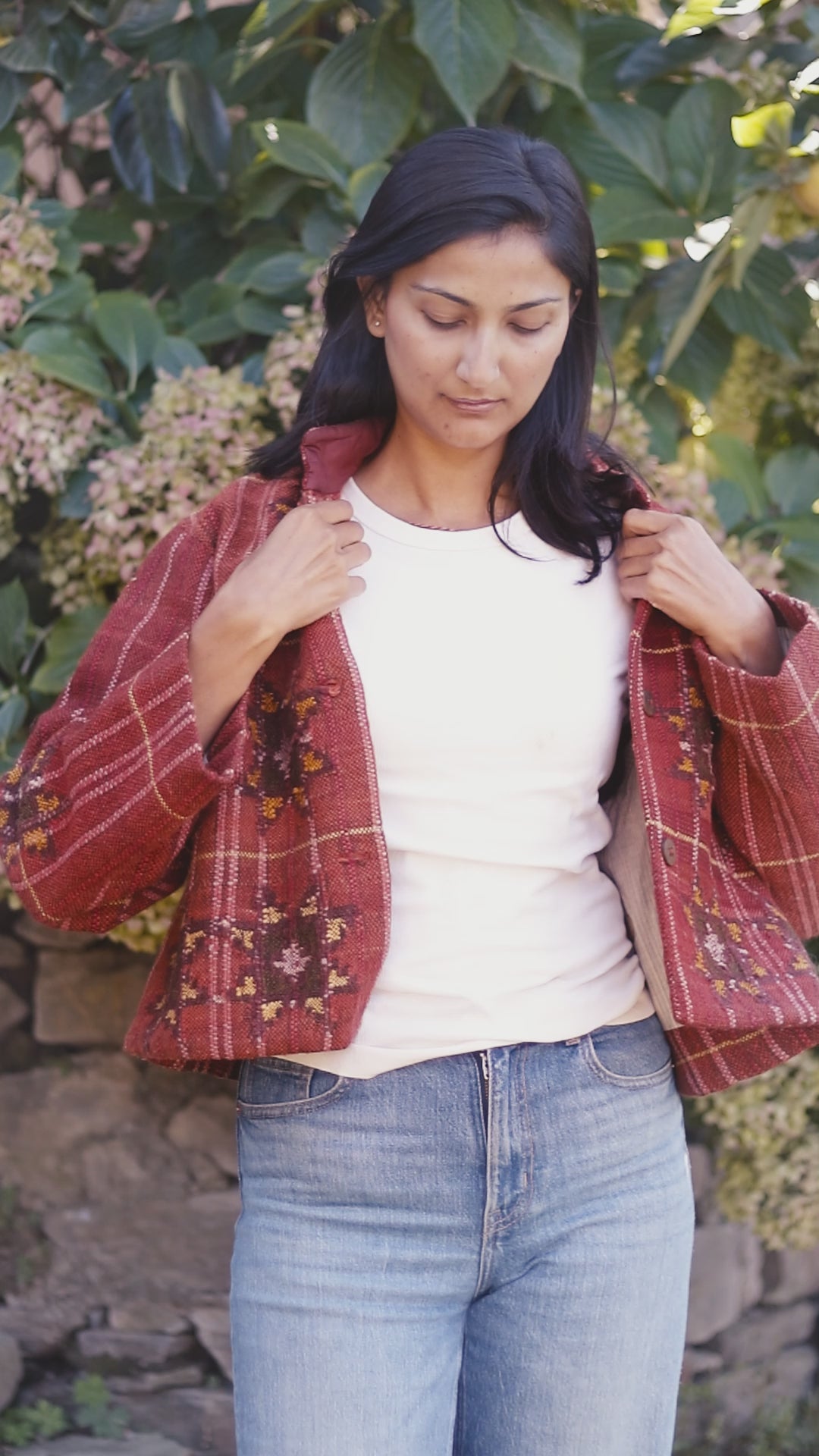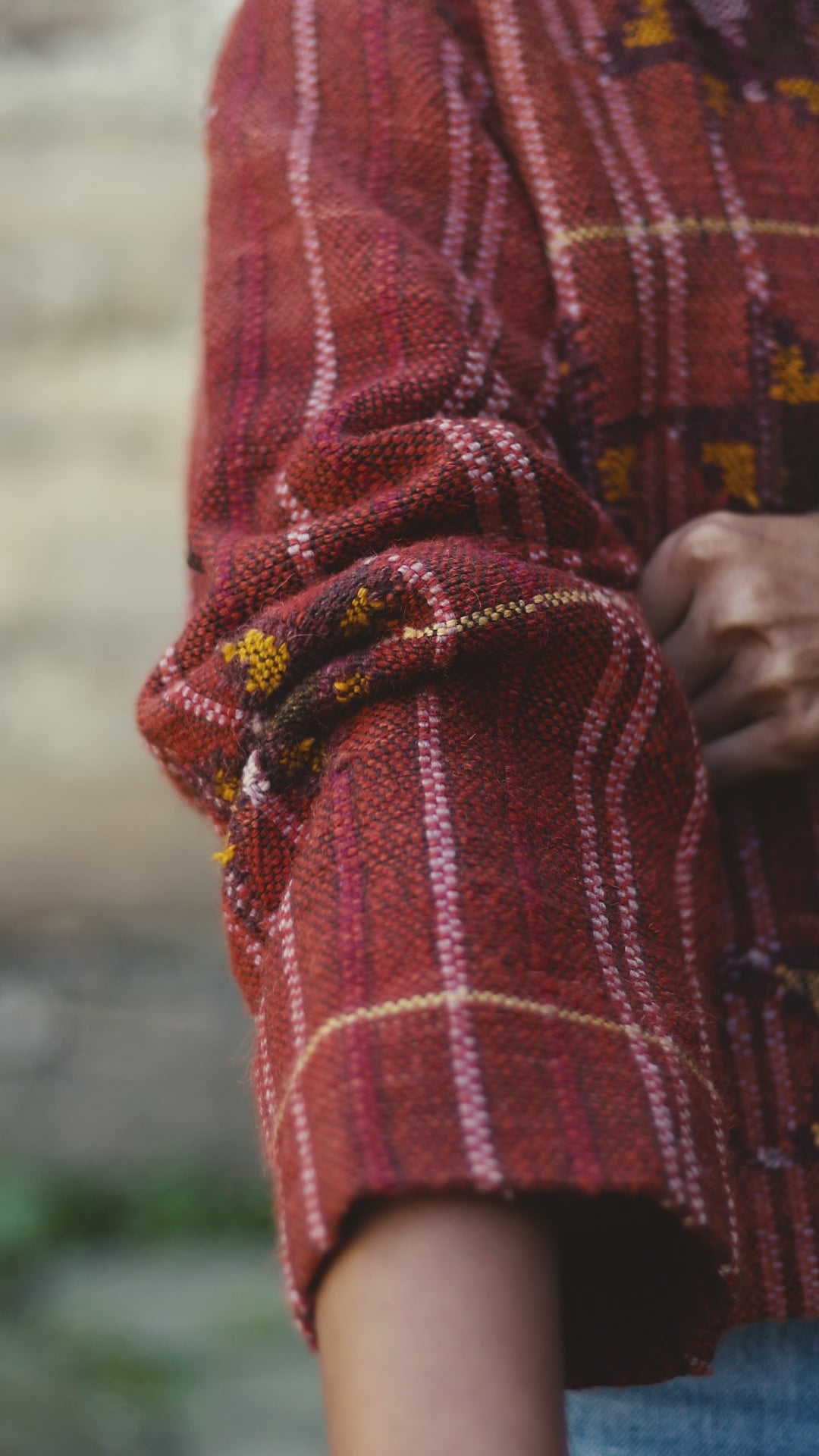 Naturally dyed with madder root, the Mirach Short Jacket draws inspiration from traditional star motifs and pattu checks found in Himalayan textiles. Its short, versatile silhouette and modern structured collar create a refined yet effortless look that pairs seamlessly with both contemporary and classic pieces.