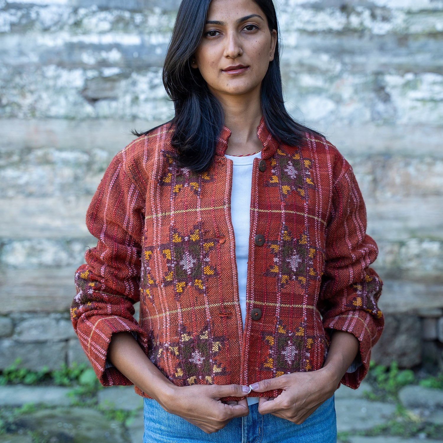Style it over a pair of jeans and a crisp white shirt or use it to add a pop of colour to a monochrome outfit this winter. Ethically made using traditional techniques, this piece supports skilled women artisans in the Himalayas and celebrates heritage craftsmanship. Handcrafted with care, this jacket blends heritage-inspired detailing with a timeless, functional design—making it a standout piece of wearable art for every season.