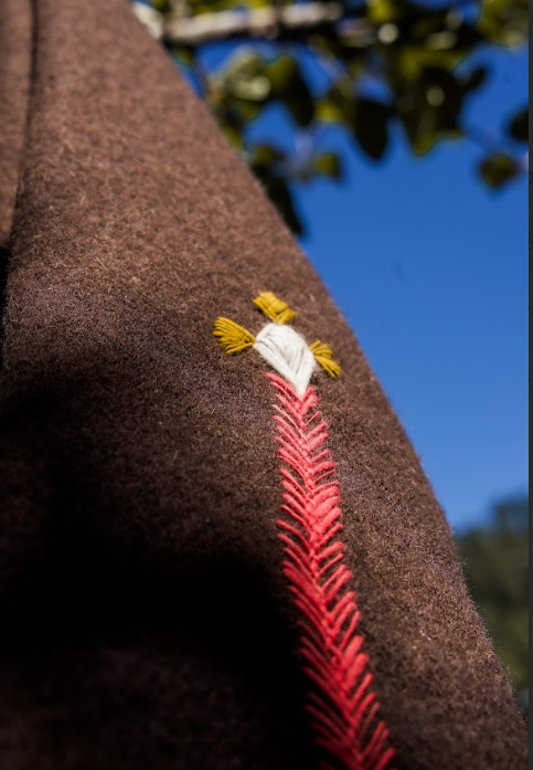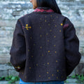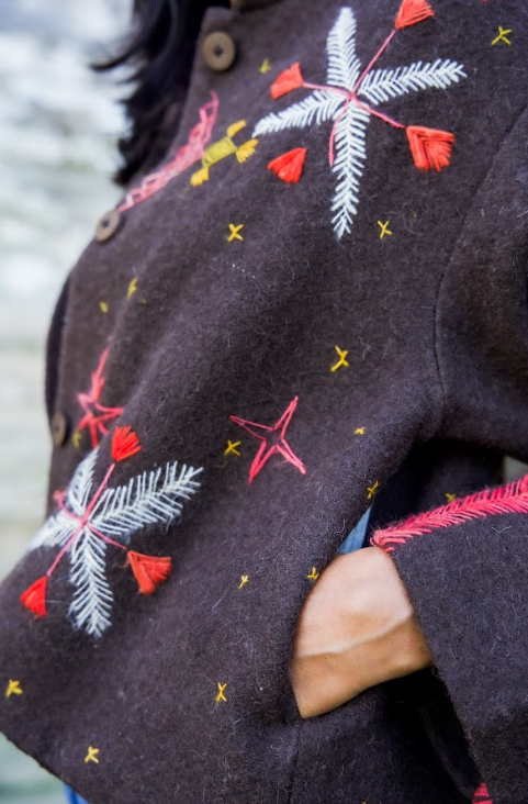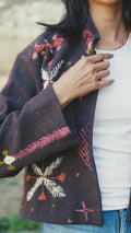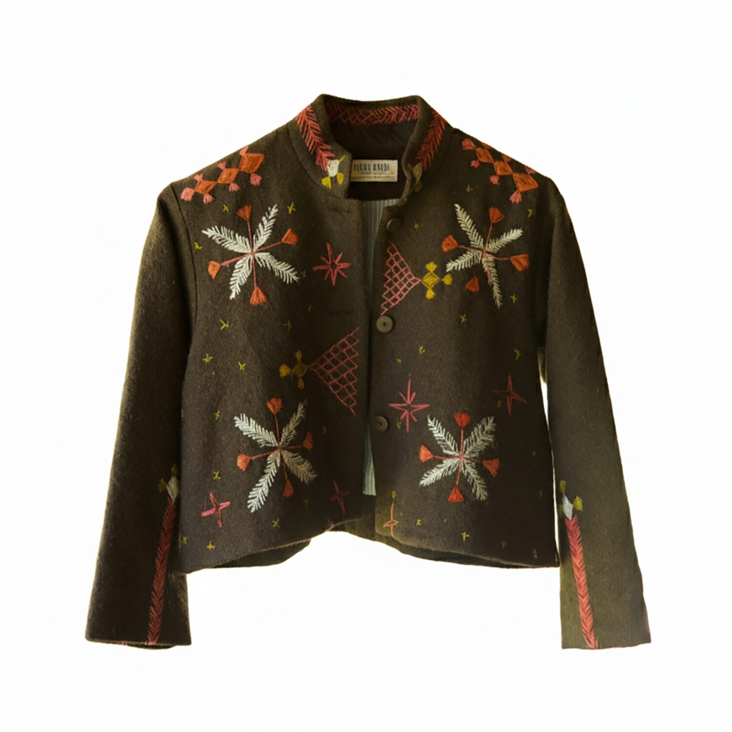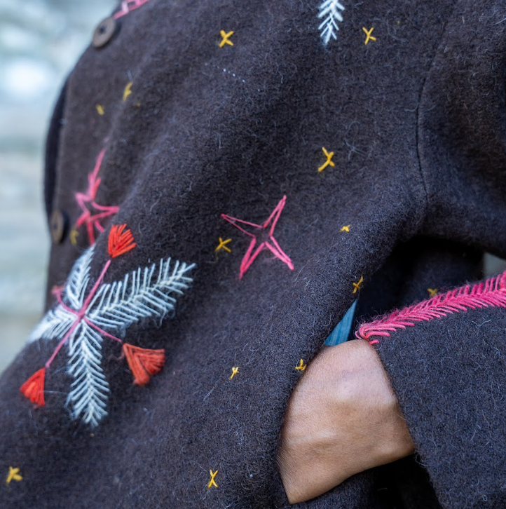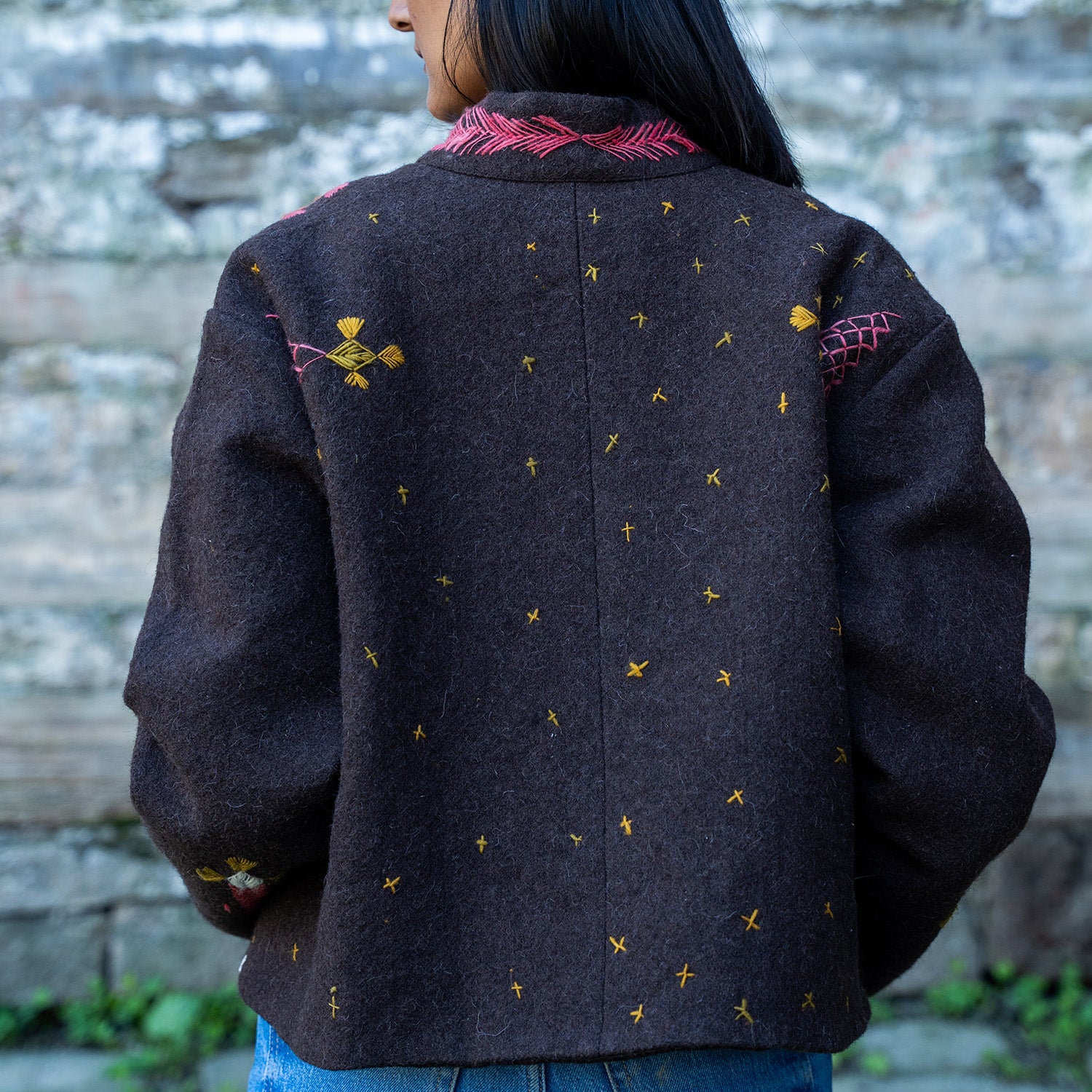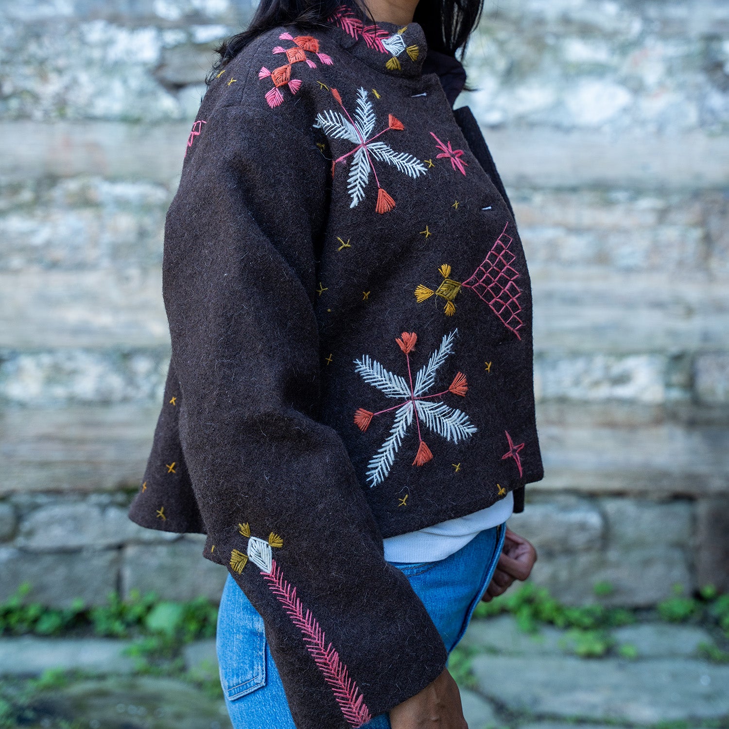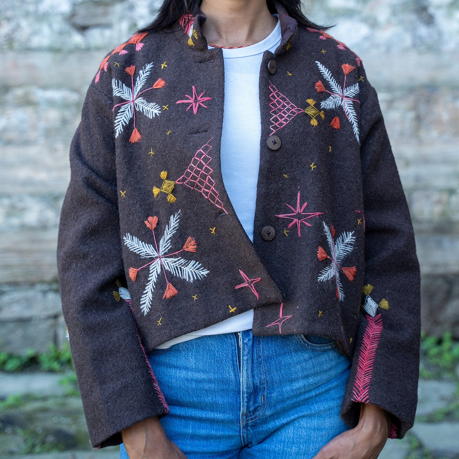 Inspired by the constellations, this jacket has motifs of stars and constellations embroidered by the nomadic Bakarwal community in kashmir on handwoven naturally brown sheep wool. Its short, versatile silhouette and modern structured collar create a refined yet effortless look that pairs seamlessly with both contemporary and classic pieces. The embroidery adds a special charm to this beautiful jacket. Style it over a pair of jeans and a crisp white shirt or use it to add a pop of colour to a monochrome outfit this winter.