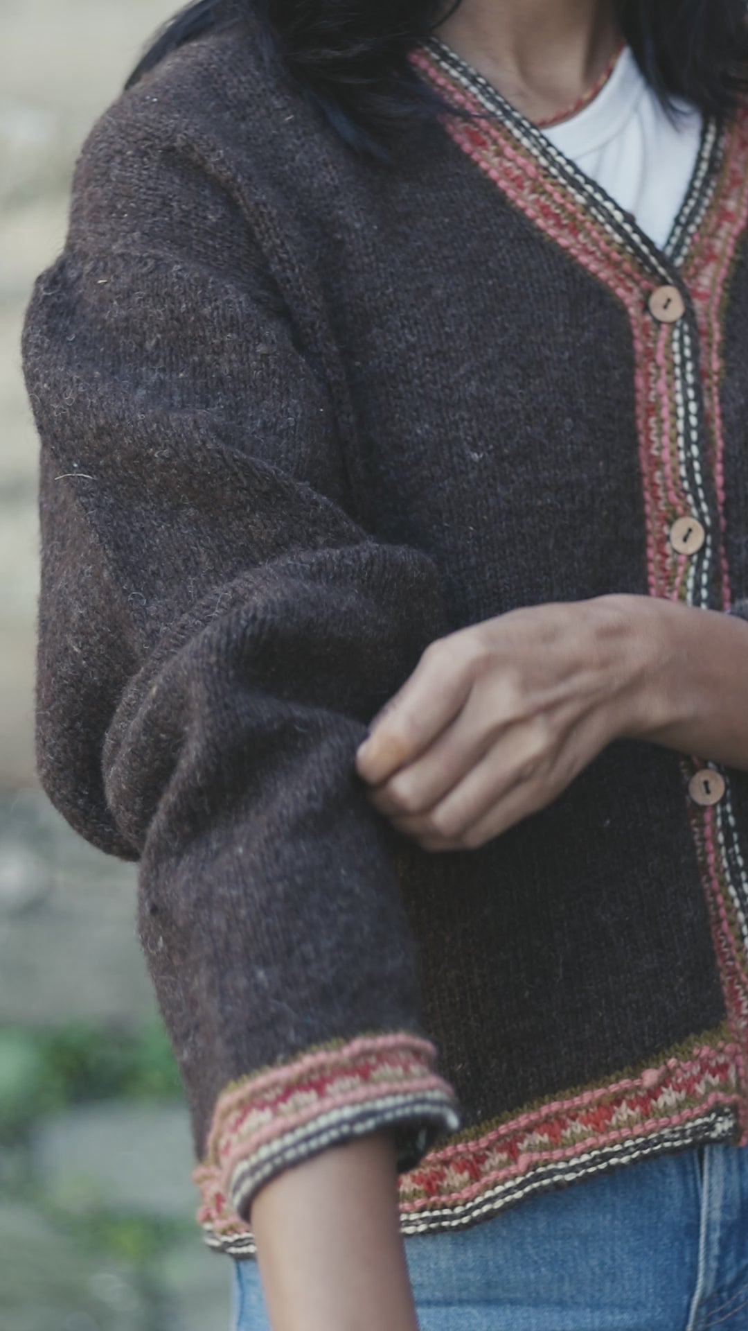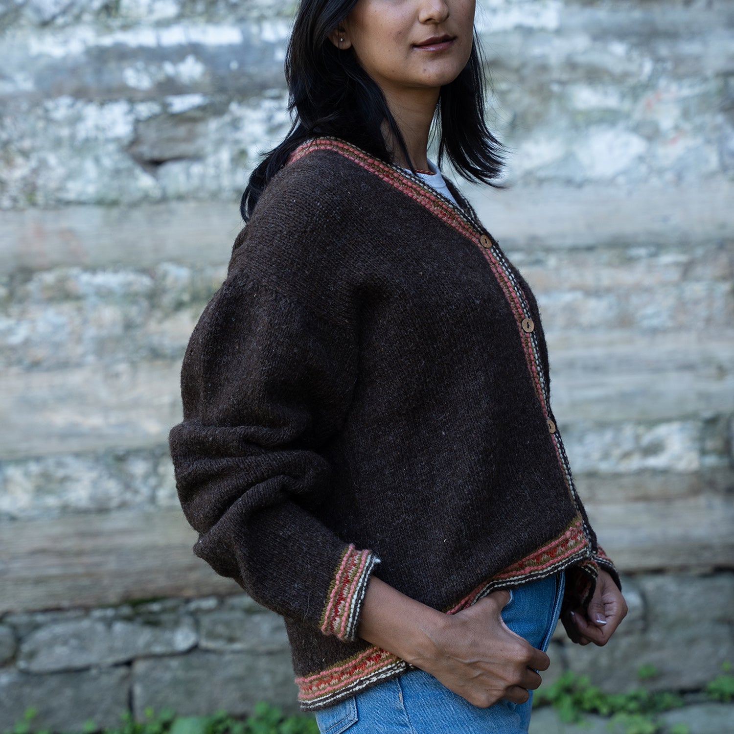 The Altair Cardigan is a timeless essential, crafted from soft, hand-spun Himalayan wool and finished with a richly patterned border inspired by traditional mountain weaves. Its minimalist silhouette allows the intricate detailing to stand out, creating a piece that feels both classic and contemporary. Lightweight yet warm, this versatile cardigan is designed for effortless layering throughout the seasons.